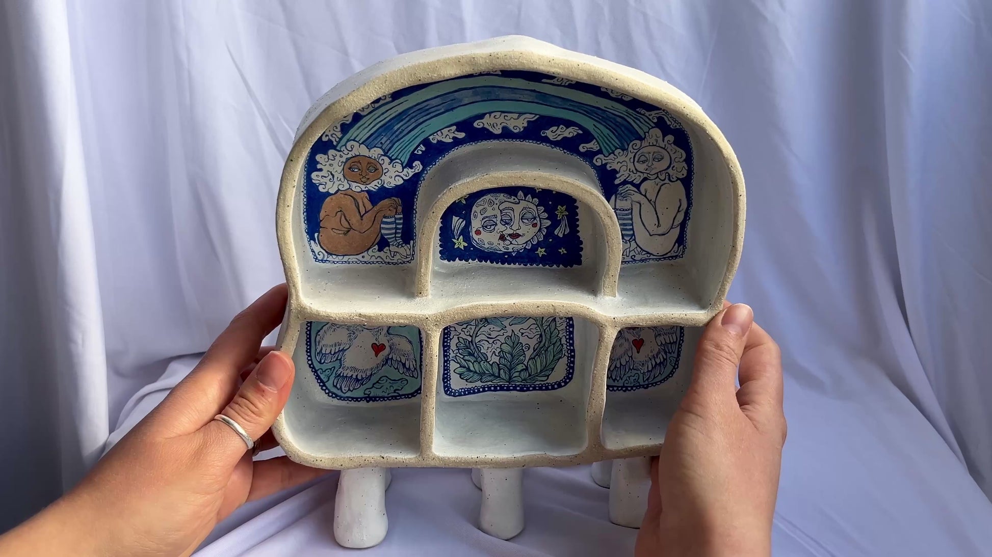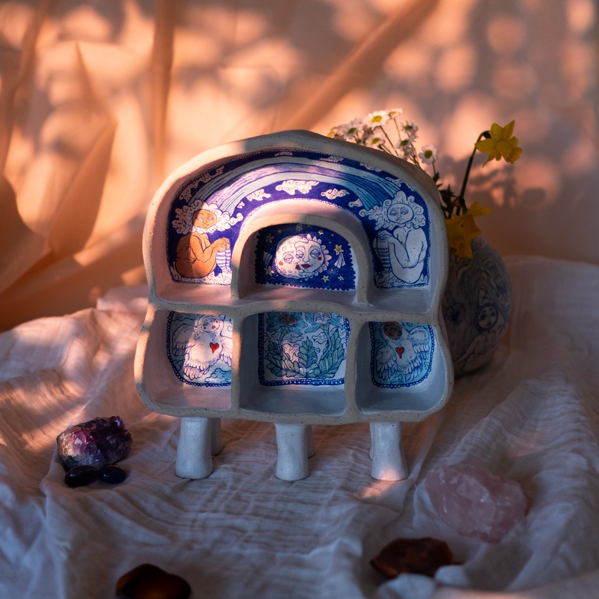 A handcrafted display piece designed to bring a sense of wonder and storytelling to your space. Made using hand-building techniques and painted with underglazes, these shelves have a beautifully textured, matte finish that enhances their organic feel. With six legs lifting it off the surface, it stands with presence - an artful home for small treasures.