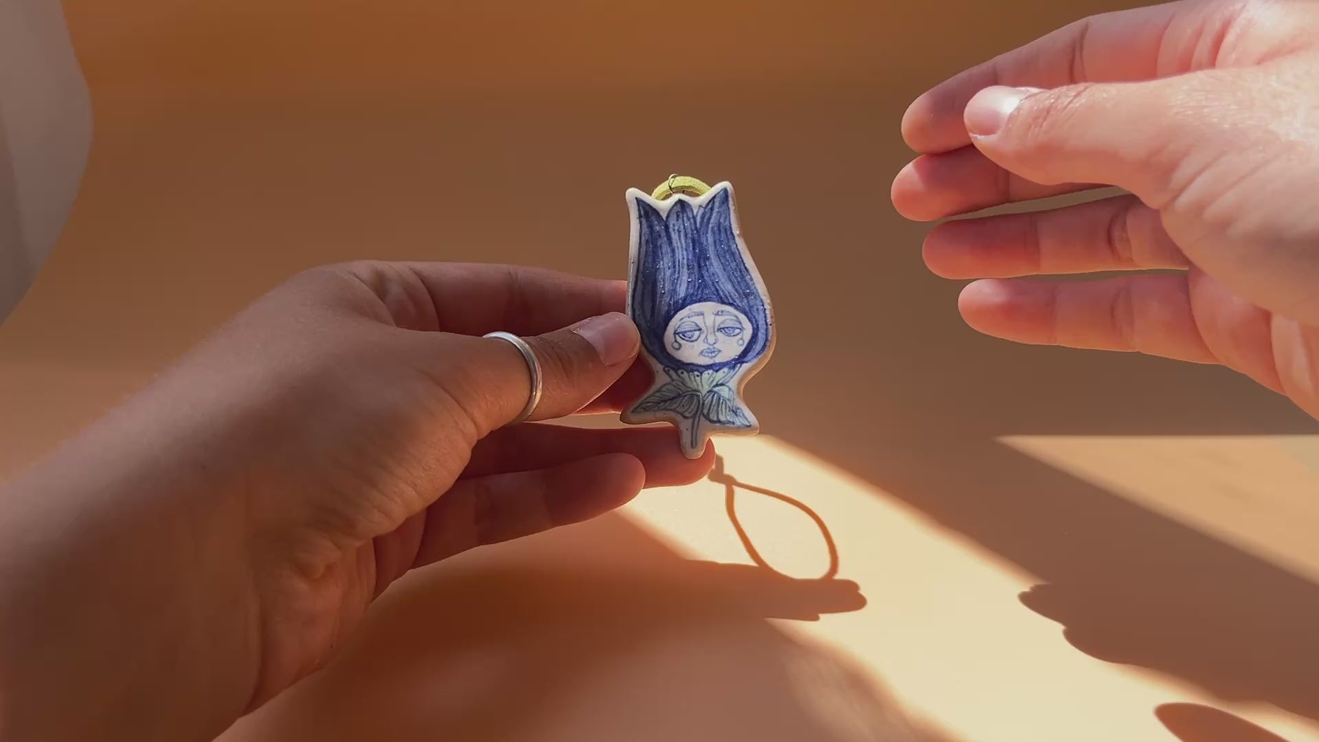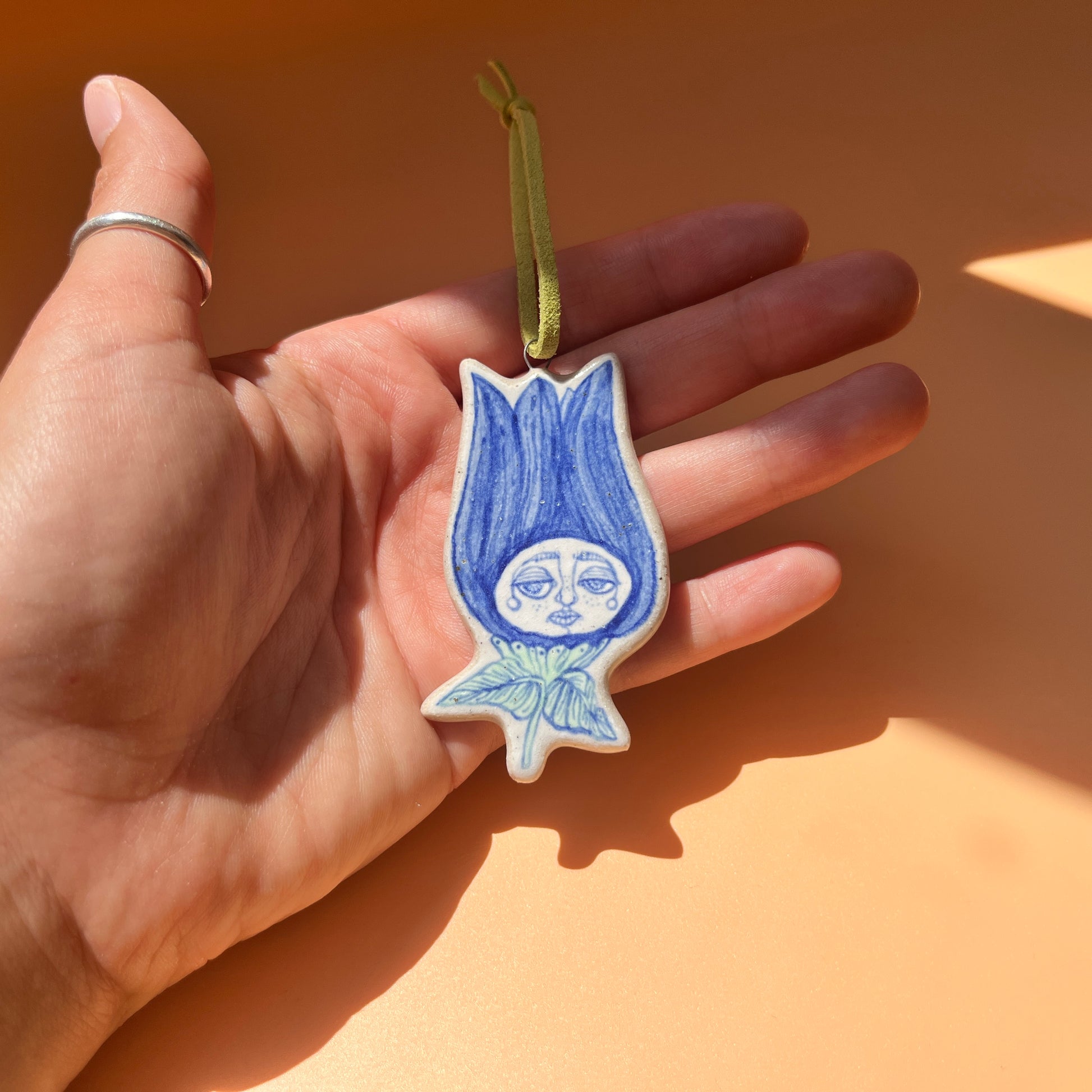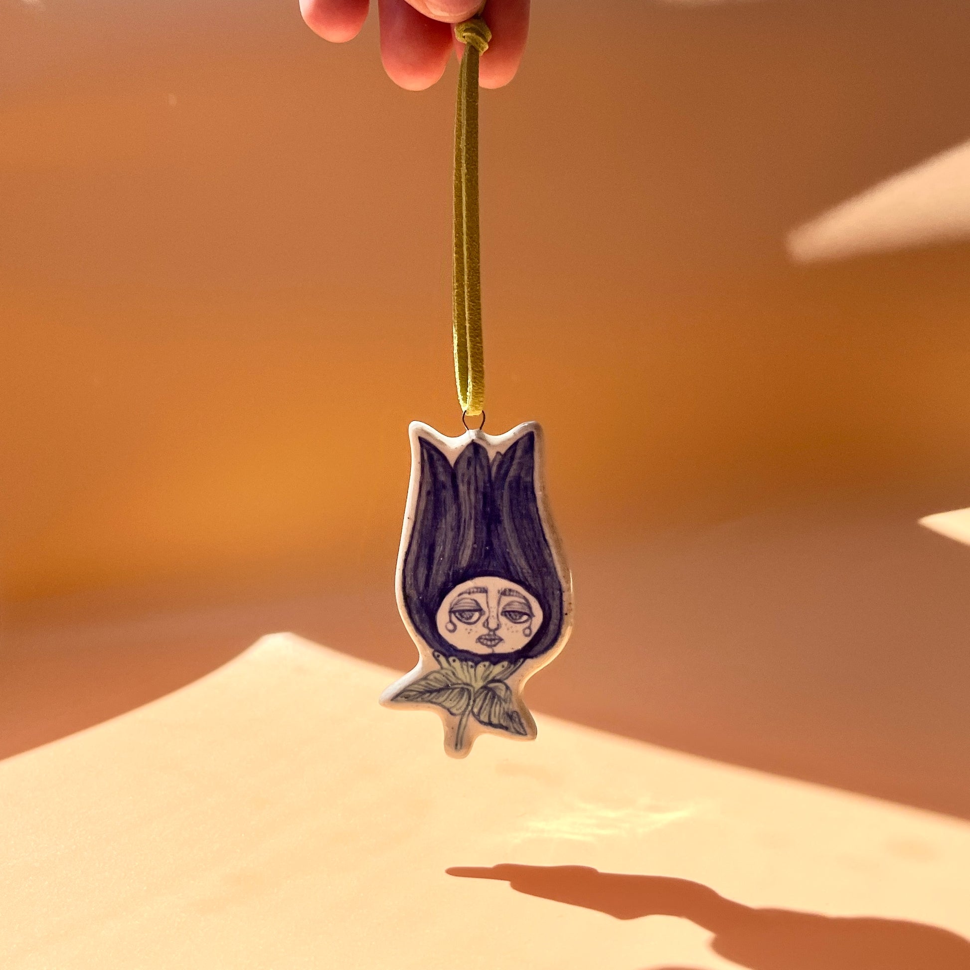 This handcrafted ceramic hanging decoration is carefully hand built from speckled stoneware clay, giving it a naturally textured and organic feel. Once shaped, it is  hand-painted with underglazes to bring its whimsical flower bud character to life before being dipped in a transparent glaze for a smooth finish.