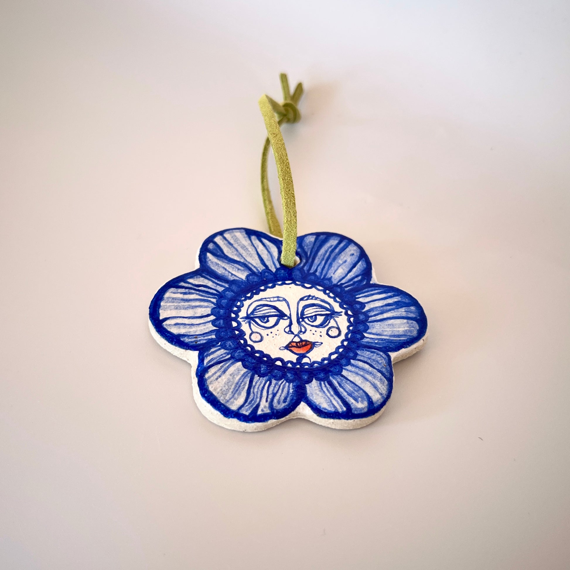 This handcrafted ceramic hanging decoration is carefully hand built from speckled stoneware clay, giving it a naturally textured and organic feel. Once shaped, it is  hand-painted with underglazes to bring its whimsical flower character to life before being dipped in a transparent glaze for a smooth finish.