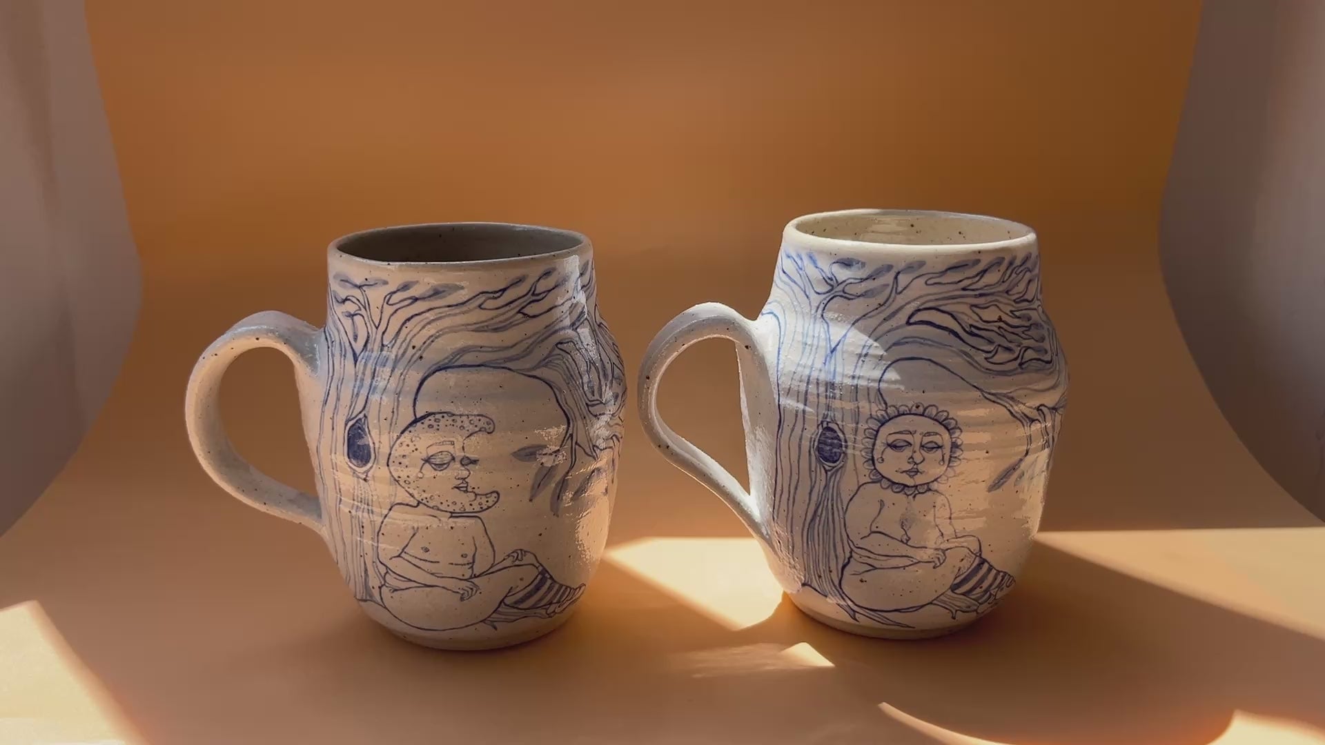 Thrown on the wheel from speckled ceramic stoneware and painted with underglazes, each mug is finished with a transparent glaze. Whether shared between two people or kept as a shifting morning-and-evening companion set, these mugs are made to hold warmth, ritual, and a little magic.