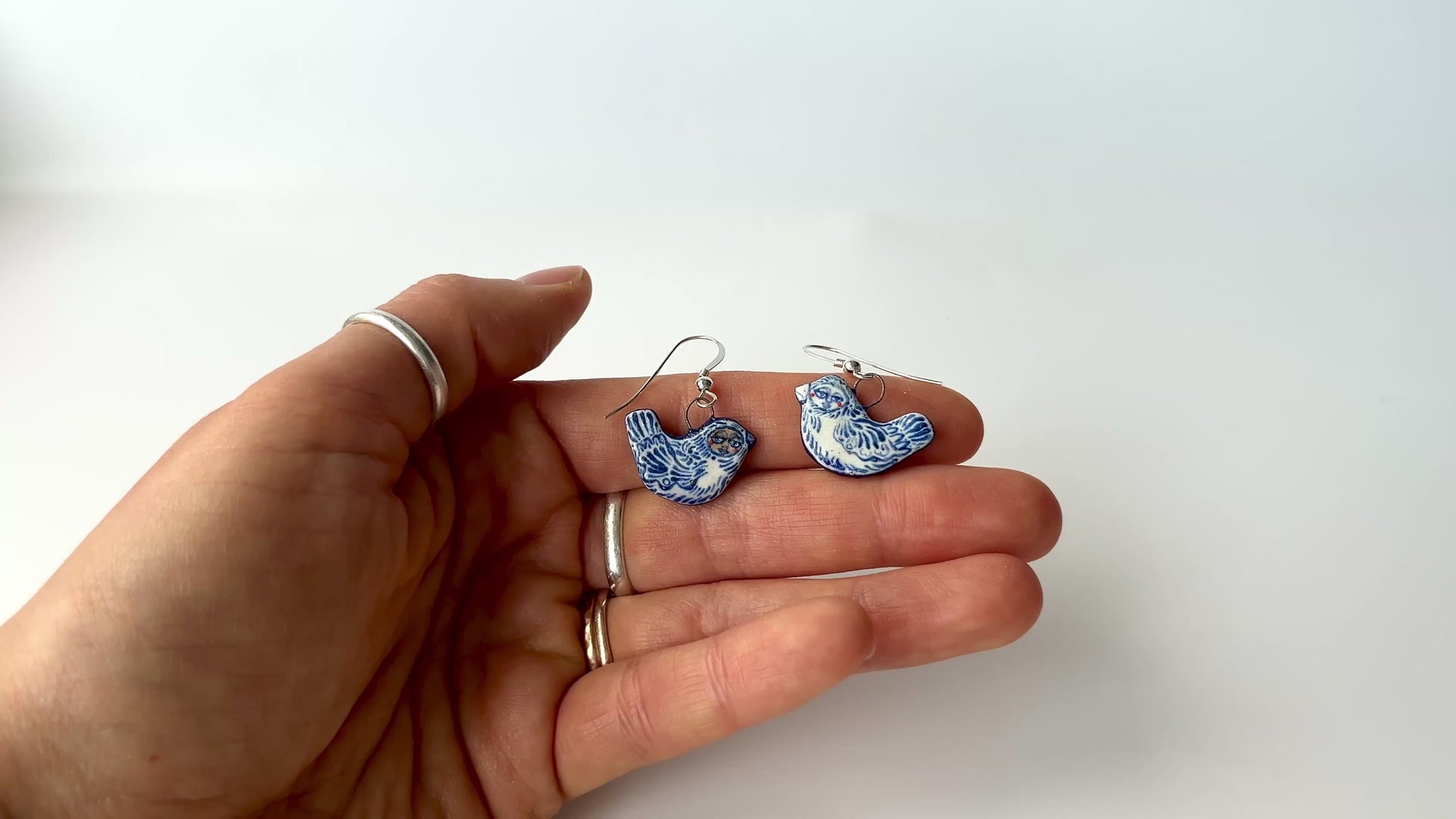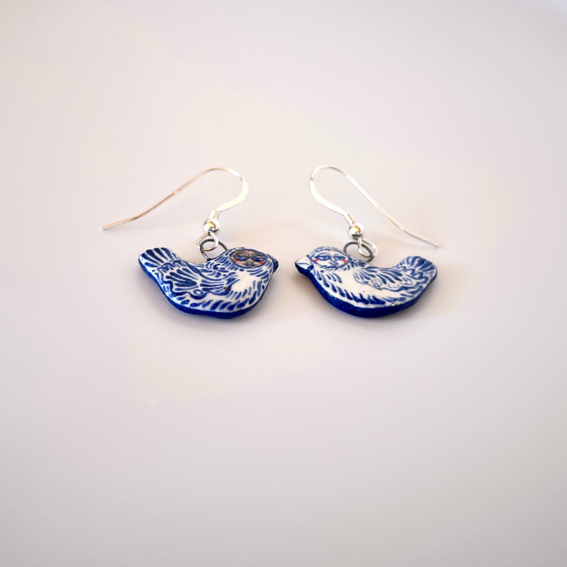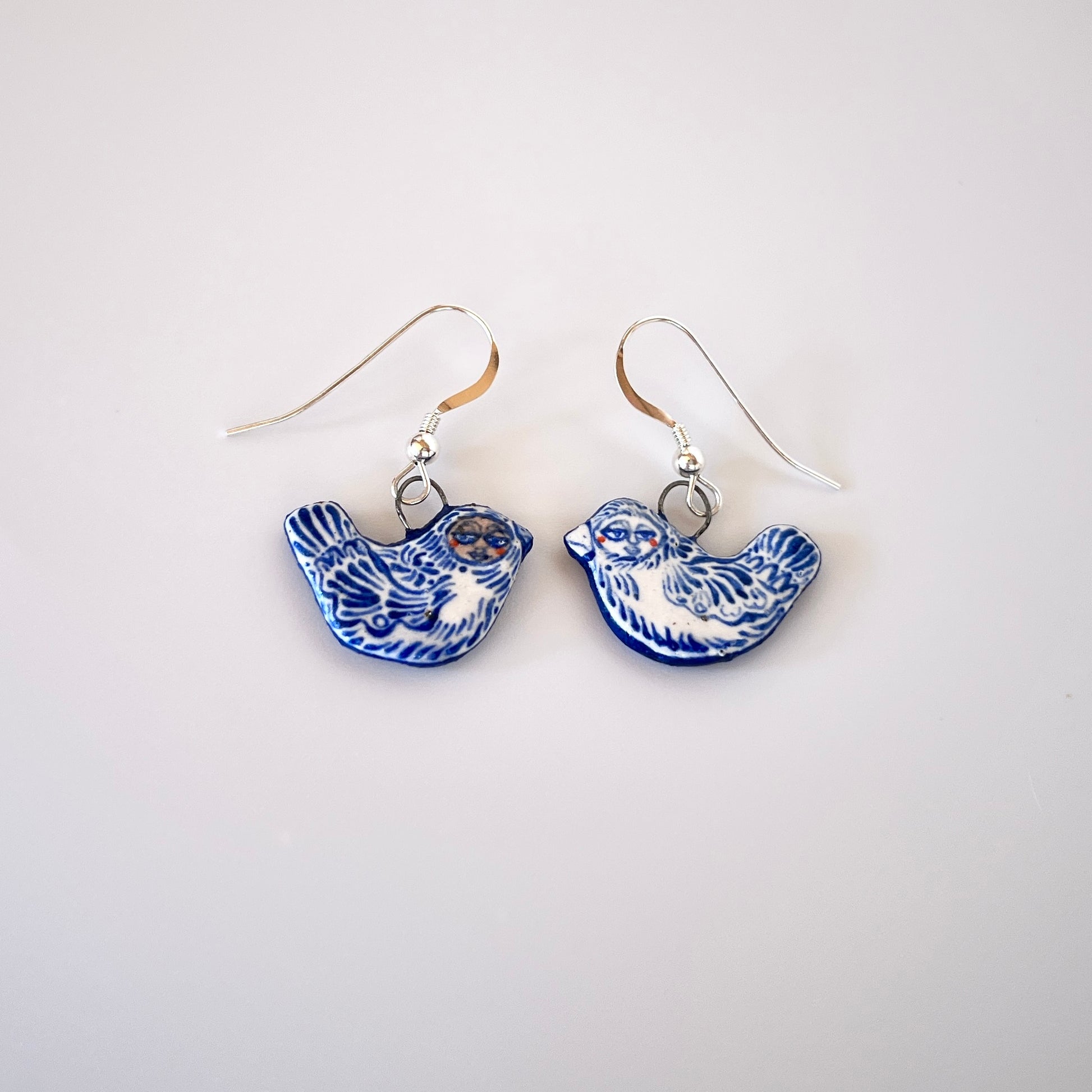 Earrings that embody freedom, transformation, and identity, these handmade ceramic bird earrings are a celebration of self-expression. Shaped like a bird and hand-painted in rich blue and white tones, they feature bird characters with a human face, blending elements of nature and individuality into a wearable piece of art.