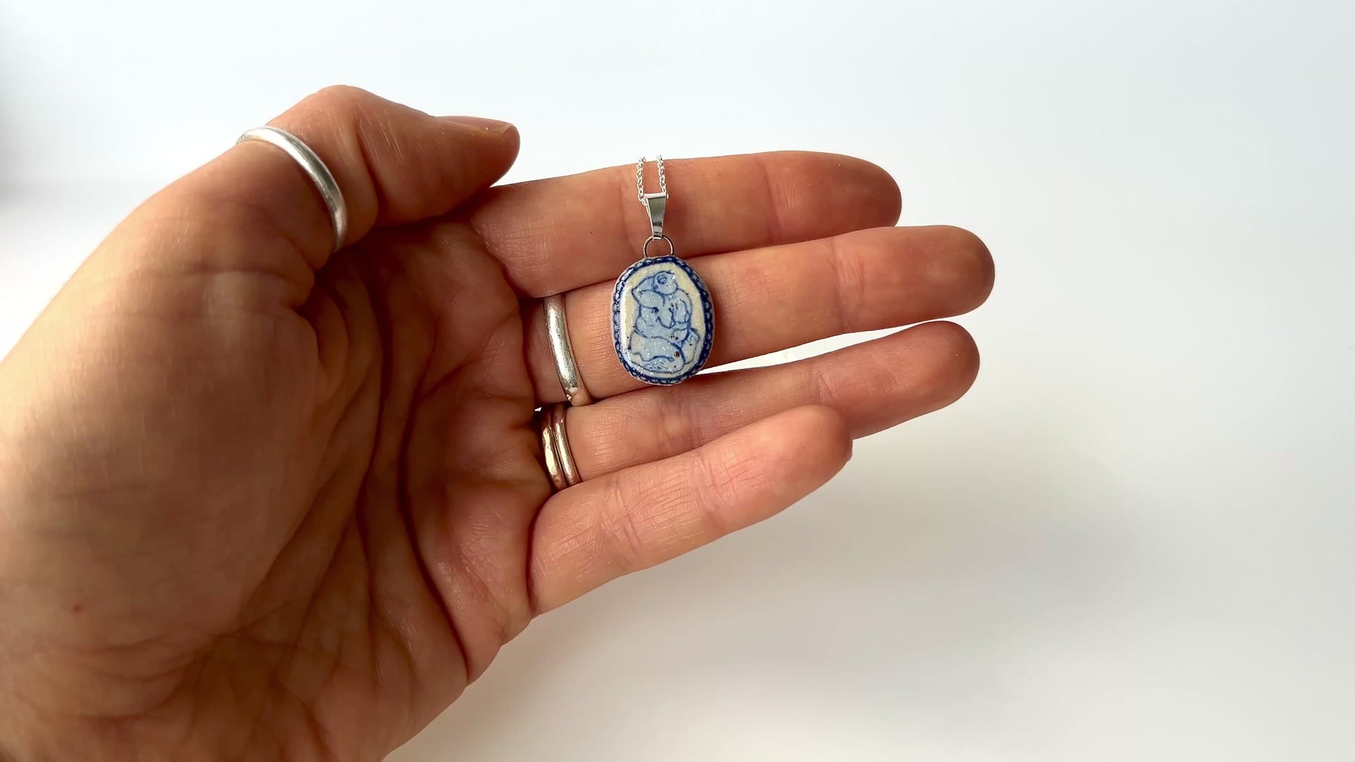 Crafted from speckled stoneware clay, the pendant is carefully shaped by hand, painted with underglazes, and dipped in transparent glaze for a subtle shine. The piece is suspended from a nichrome wire loop and connected to a 925 sterling silver link, paired with a complimentary 18-inch 925 sterling silver chain.