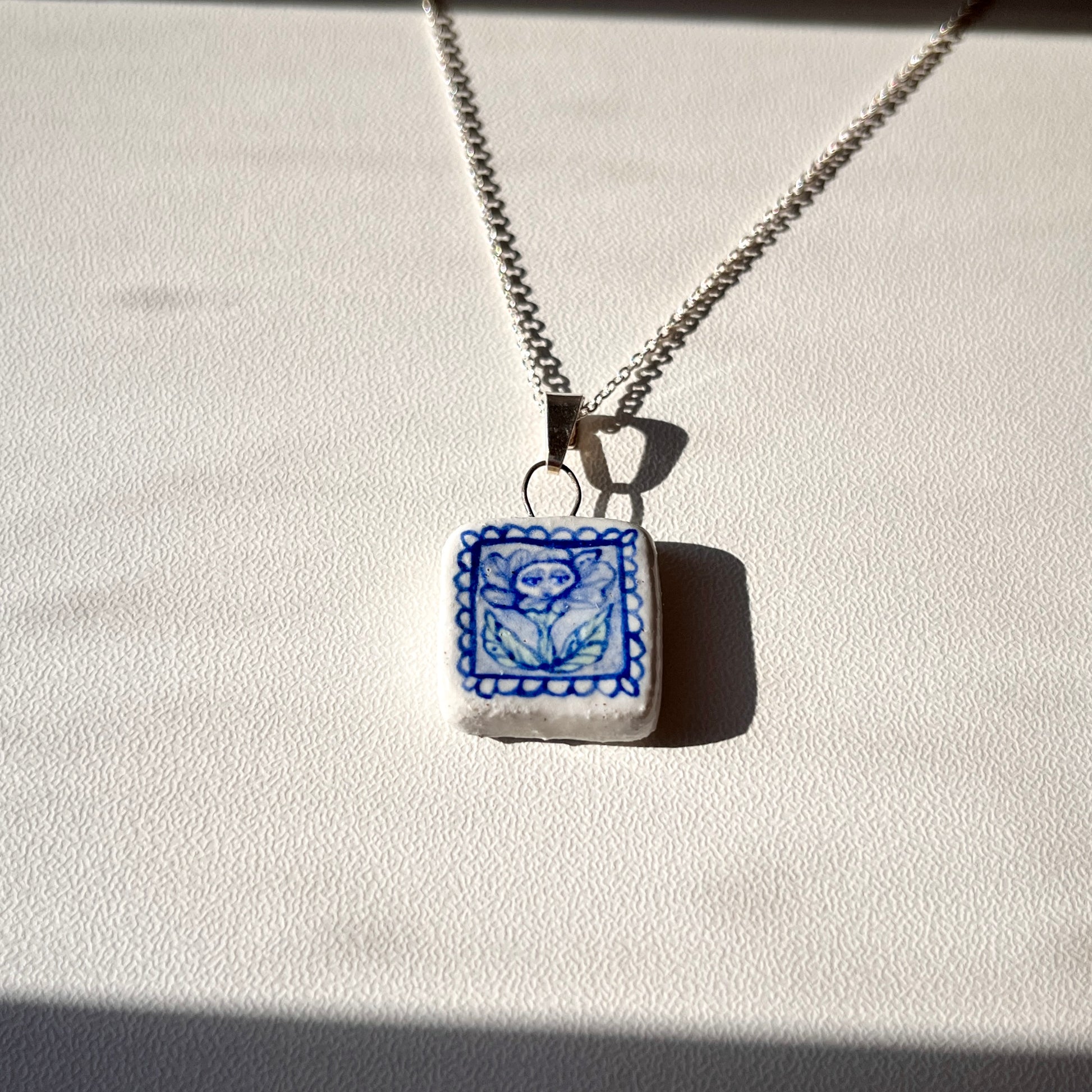 Handmade Square Ceramic Pendant Necklace – Flower Person Design (Sterling Silver, Botanical Jewellery)