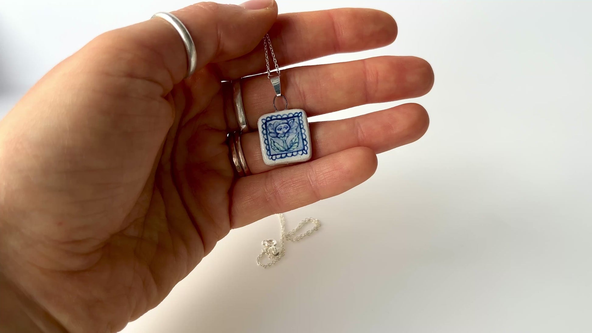 Each pendant is hand-built from speckled stoneware clay, hand-painted with underglazes, and finished with a smooth transparent glaze. A nichrome wire loop and 925 sterling silver link secure the pendant to an 18-inch 925 sterling silver chain, creating a lightweight piece perfect for everyday wear.